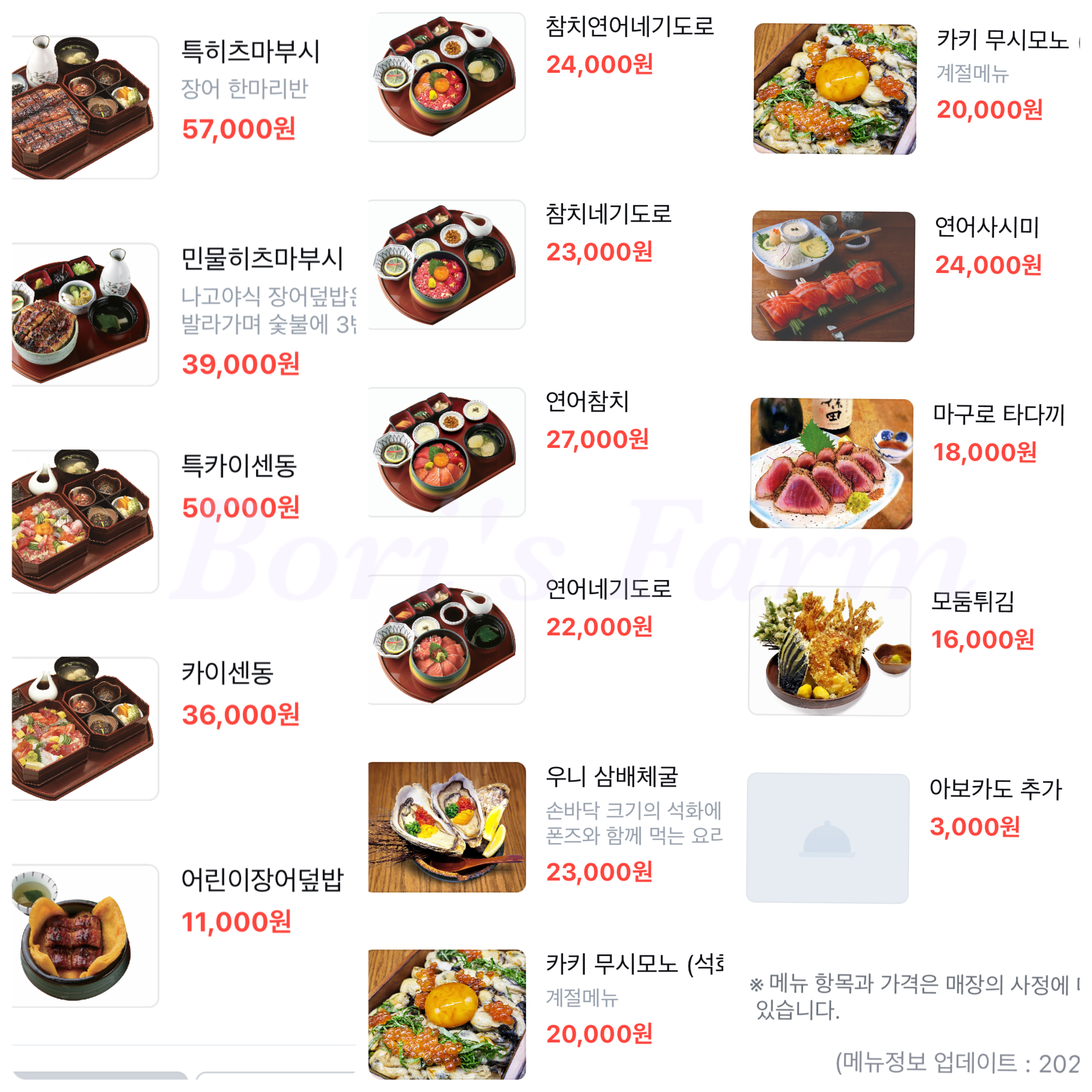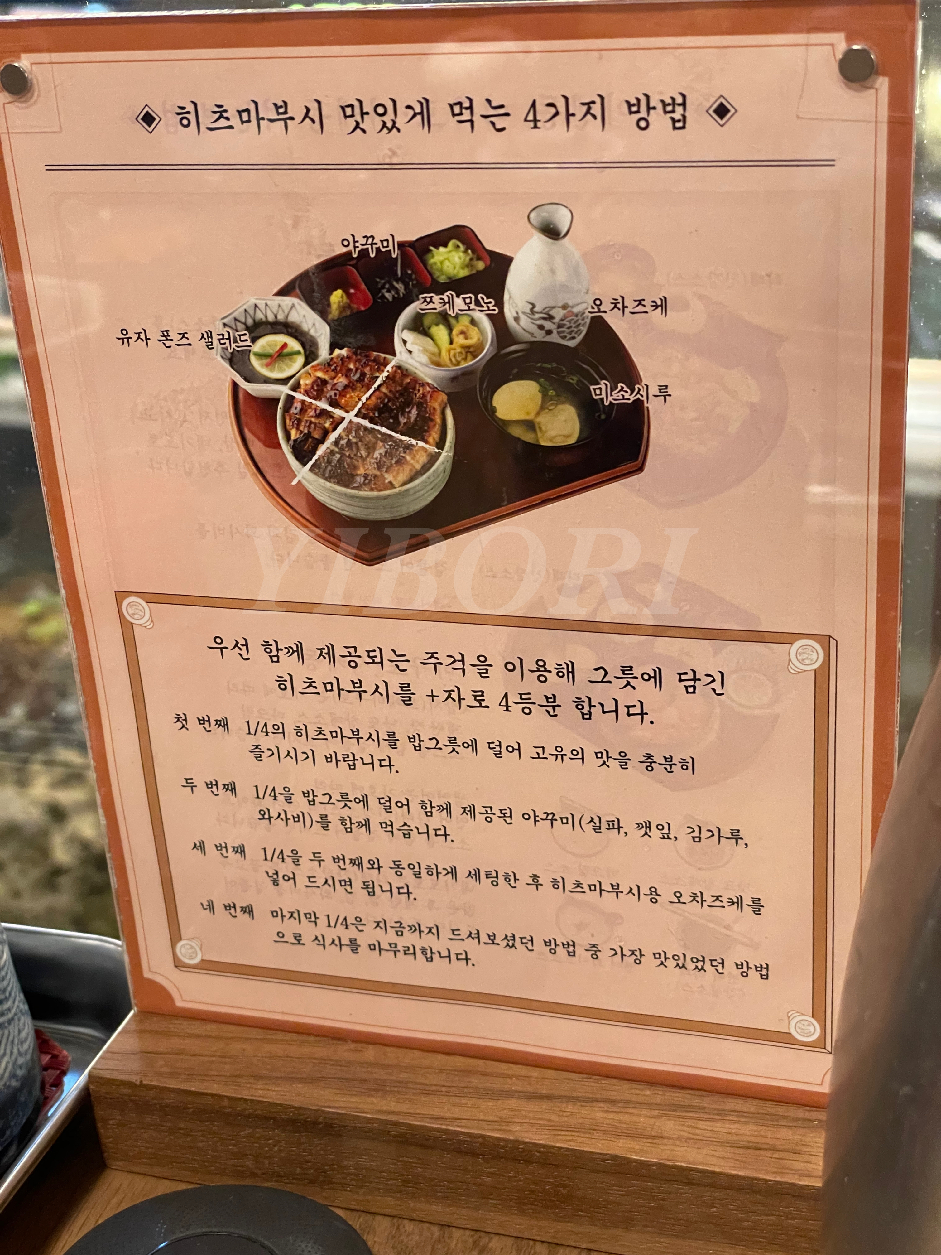 히츠마부시용 설명서만 찍어왔지만 테이블마다 히츠마부시와 카이센동 먹는 방법이 나와 있었다. 나는 장어와 밥 따로 먹는 걸 선호하는 편이라 지침을 따라서는 아주 약간만 시도했고, 히츠마부시용 오차츠케가 맛있어서 따로 조금 따라서 마셨다. 메인 요리도 괜찮았지만 국도 따끈하고 진했고, 주키니로 절임이 아삭하고 맛있었고 카이센동에 나온 디저트도 맛있었다.