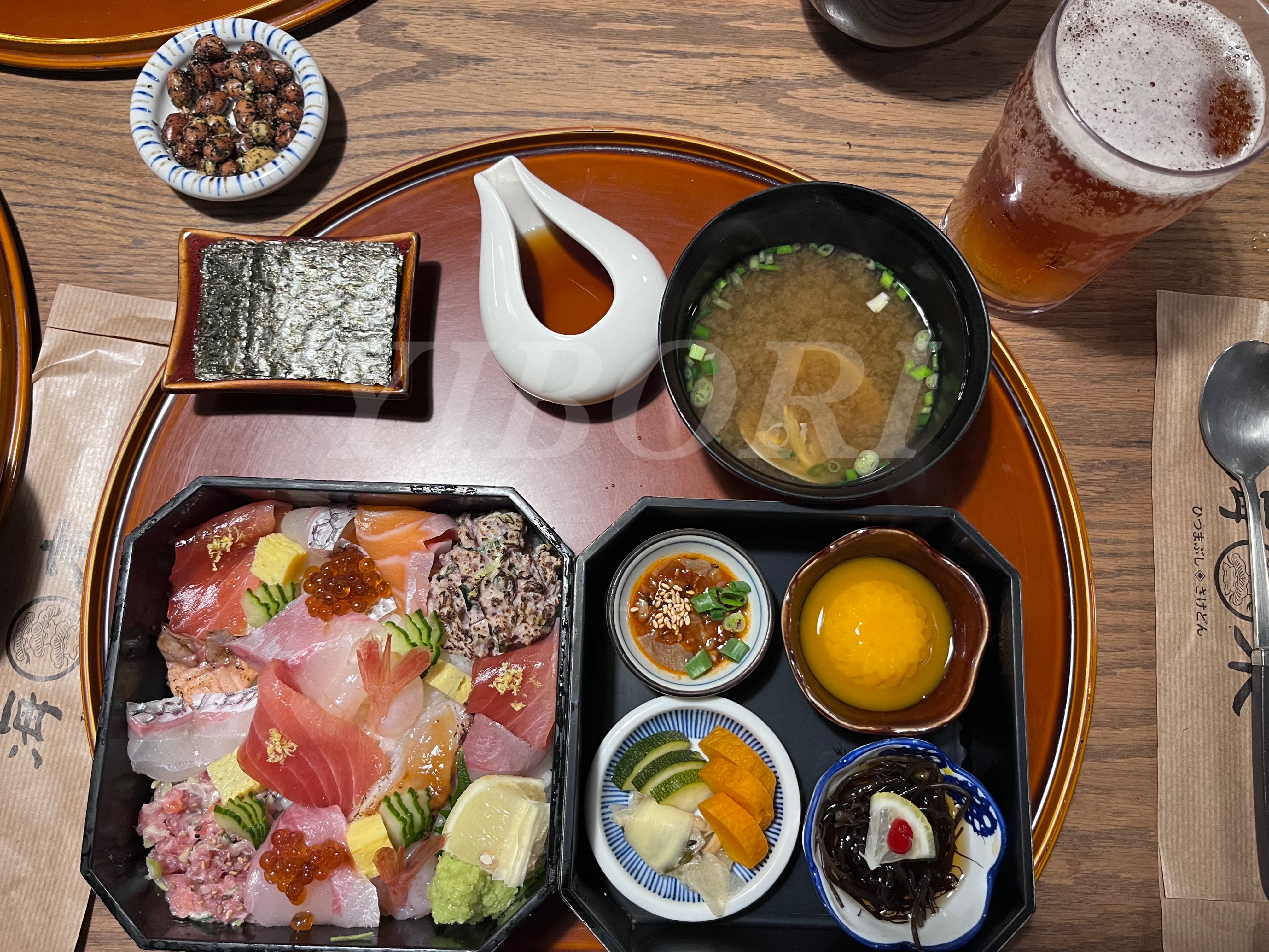 엄마는 장어, 동생은 카이센동으로 호텔에서 이미 정한 와중에 나 혼자 둘 사이에서 엄청나게 고민하다가 -하나를 특으로 시키고 사이드를 시킬 것이냐 등등- 결국 히츠마부시2, 카이센동 1에 레드락 생맥주까지 주문완료. 맥주와 짭짤한 땅콩 한 접시가 먼저 나왔다. 생맥주 컵이 플라스틱이라 음식 가격에 비해 너무하다고 했더니 동생왈 '요샌 리버스탭이라고 컵을 대면 아래에서부터 맥주가 올라온다고' 그런데 한 모금 마시는데 자꾸 흐르는 맥주. 자꾸 뚝뚝 떨어지는 맥주 🤣🤣 점원분에게 말했더니 잔이 좀 샌다고 새로 가져다 주셨다.